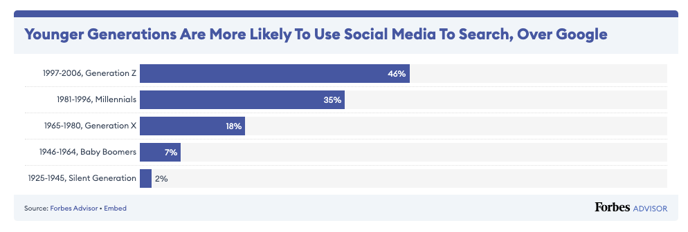 A recent Forbes study revealed that 46% of Gen Z and 35% of Millennials now prefer social media sites over traditional search engines.