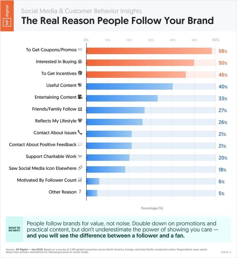The truth is, most people follow brands for practical reasons—like coupons, incentives, or useful content. Want to grow your audience? Focus on what they value: