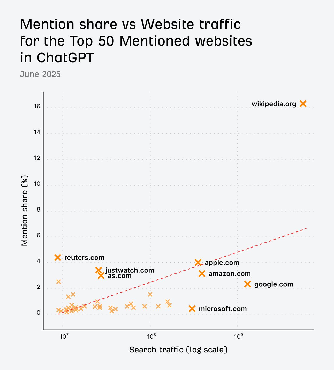 Wikipedia was extremely dominant for ChatGPT mentions. They were mentioned 16.3% of the time. New sites were also strongly represented in this index.