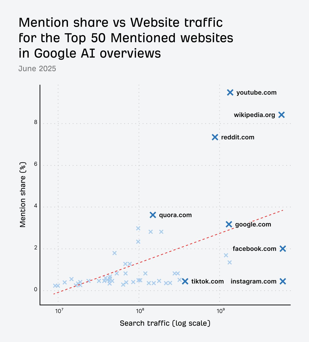 YouTube, Reddit, Quora, and Wikipedia were over-represented compared to their traffic levels. While social media sites like Facebook, Instagram, and TikTok were under-indexed.