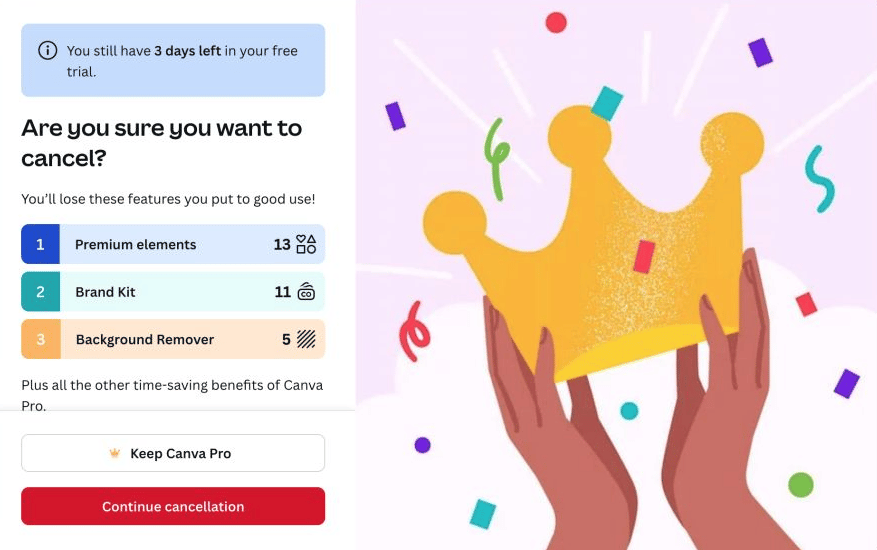 Canva reminds them about features they consistently use that they will lose access to if they cancel their account.