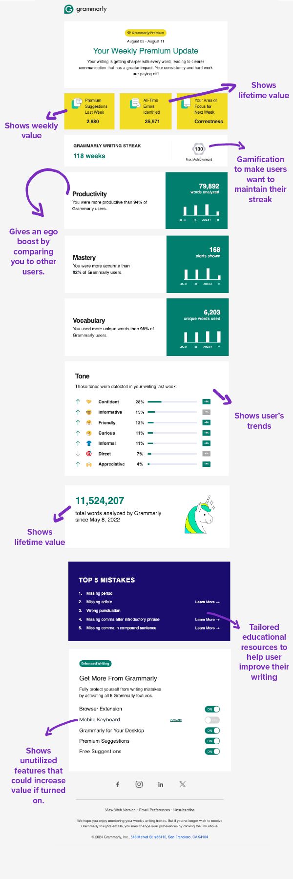 Every section shows the user metrics and proof of the specific ways they’re extracting value from Grammarly.