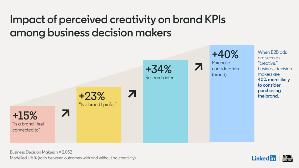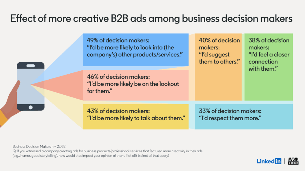 Creative ads also have a better impact on sales. B2B decision makers are 40% more likely to consider purchasing the brand if their ad is seen as “creative.”