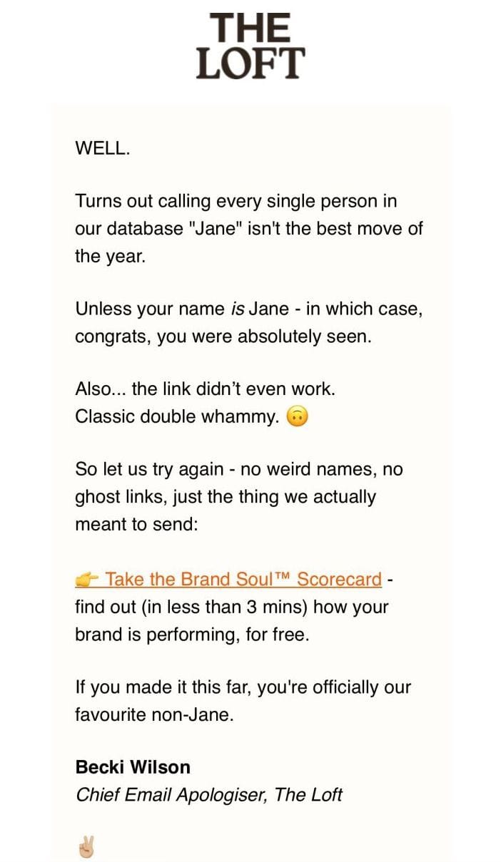 This week, we came across a gem from The Loft, a brand that accidentally called every subscriber Jane. (Also, the link was broken. Legendary.)